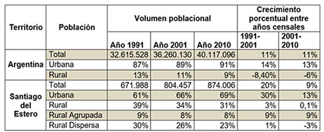 En Santiago del Estero en cambio, el volumen poblacional entre los años de 1991 a 2001 tuvo un incremento del 20%, registrando así también, un aumento de variación del 30% de la población urbana. A su vez, a diferencia de lo que sucedía en el país, la población rural aumentaba un 3%. Durante los años 2001 a 2010, el crecimiento absoluto de la población no ha sido significativo -comparado con el anterior periodo-, estancando su crecimiento en un 9%. A pesar de ello, lo interesante de este último periodo se vincula a que la población rural no ha exhibido variación, por el contrario, la población rural dispersa ha disminuido un 3%, siendo captada por la población rural agrupada, que al igual que en el periodo anterior (1991-2001) se conservó con una variación del 9%.