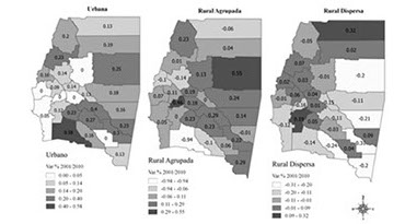 Como se observa, la mayoría de los departamentos experimentaron una evidente dinámica en cuanto a la variación intercensal de sus categorías de población, excepto Atamisqui que presenta valores positivos para las tres categorías seleccionadas y Quebrachos que muestra una palmaria disminución de la población rural dispersa.