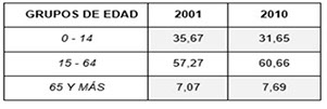 En relación a ello la figura 7, exhibe la distribución poblacional entre los años 2001-2010 relativos a la edad por grandes grupos, sobre todo deteniendo la mirada en la población económicamente activa (PEA). Resulta notoria la dinámica positiva que tuvo la población del grupo en edad activa (15 a 64 años) entre los dos periodos censales con un incremento mayor al 3%. Sin embargo, en cuanto al nivel de la distribución de la población en edades pasivas transitorias y niñez se advierte un descenso significativo de sus pesos. Según Gómez (2004), sostiene que es una tendencia el hecho de tener una tasa de natalidad decreciente y una tasa de longevidad creciente a lo largo de los años [7].